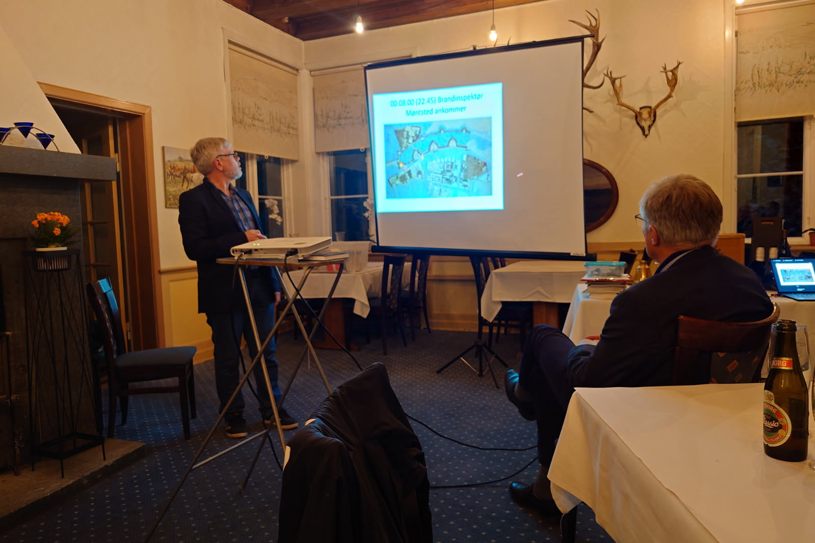 En af Rotary medlemmerne ringer med en klokke som tegn på, at mødet skal gå i gang. Under spisningen har jeg overvejet, hvordan jeg skal afkorte min planlagte foredrag. 45 minutter inklusiv spørgsmål er lidt mindre end jeg havde regnet med. Det lykkes dog fint at holde tiden. Jeg har efterhånden holdt foredrag om Holmenkatastrofen en del gange og ved, hvad der er vigtigst at få med.